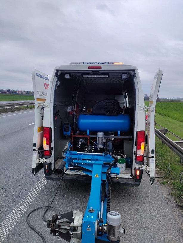 Pojazd serwisowy posiada kompletne wyposażenie umożliwiające serwisowanie ogumienia w pojazdach ciężarowych czy też wózkach widłowych.
